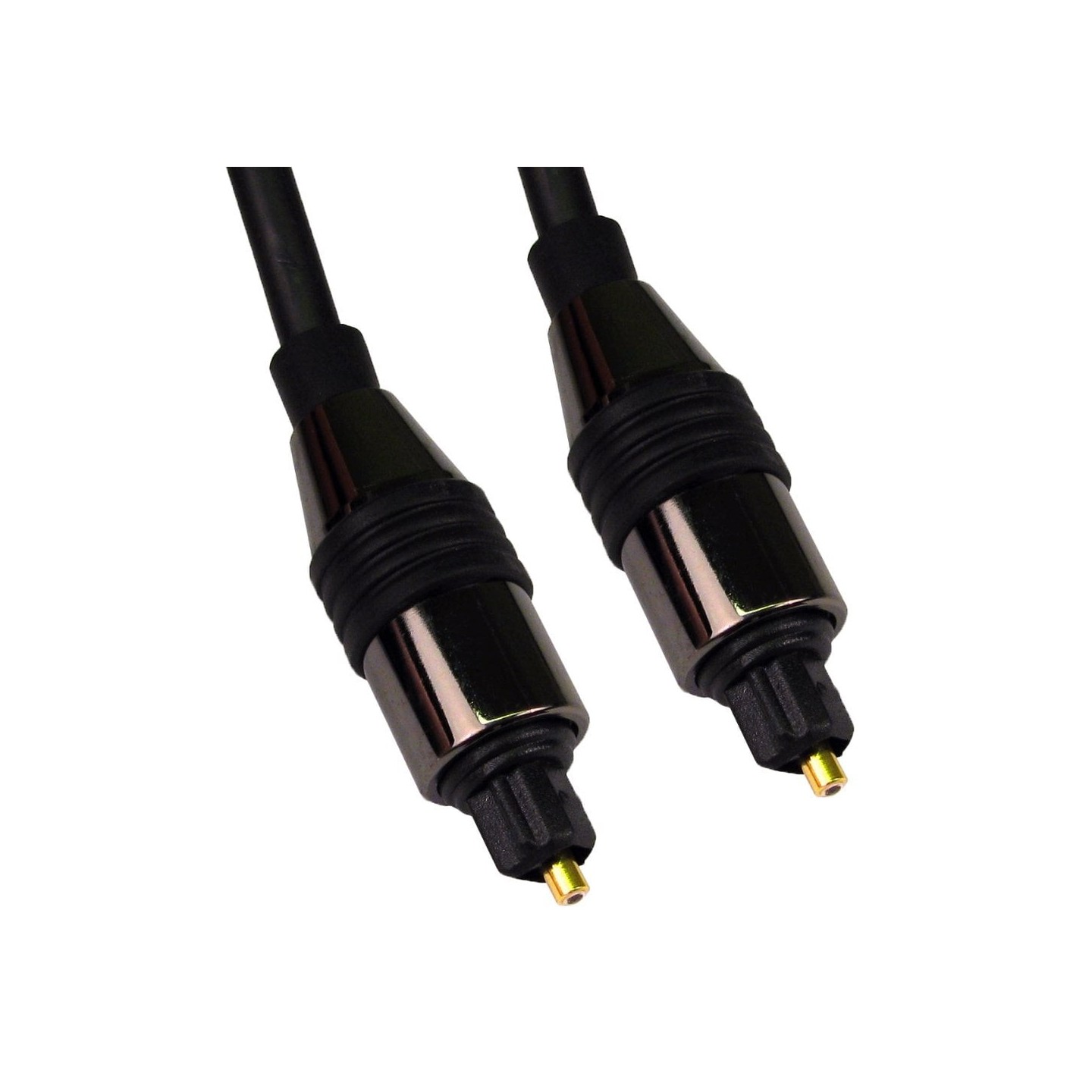 TOSLINK® or Optical Cable is a fiber optic connection system. Most commonly used with audio equipment (via a digital optical socket,) where it carries a digital audio stream from devices such as CD, DVD, Blu-Ray players and modern video game consoles, to an AV receiver such as surround sound system that can decode the stream of audio and output it through a set of loudspeakers. Since TOSLINK uses fibre-optic cable, it is free from distortion caused by electrical or magnetic interference that an electrical cable would incur.The result is an audio signal that is purer, as well as truer to the original recording. Gold plating is used on the connectors for its anti-corrosive properties.