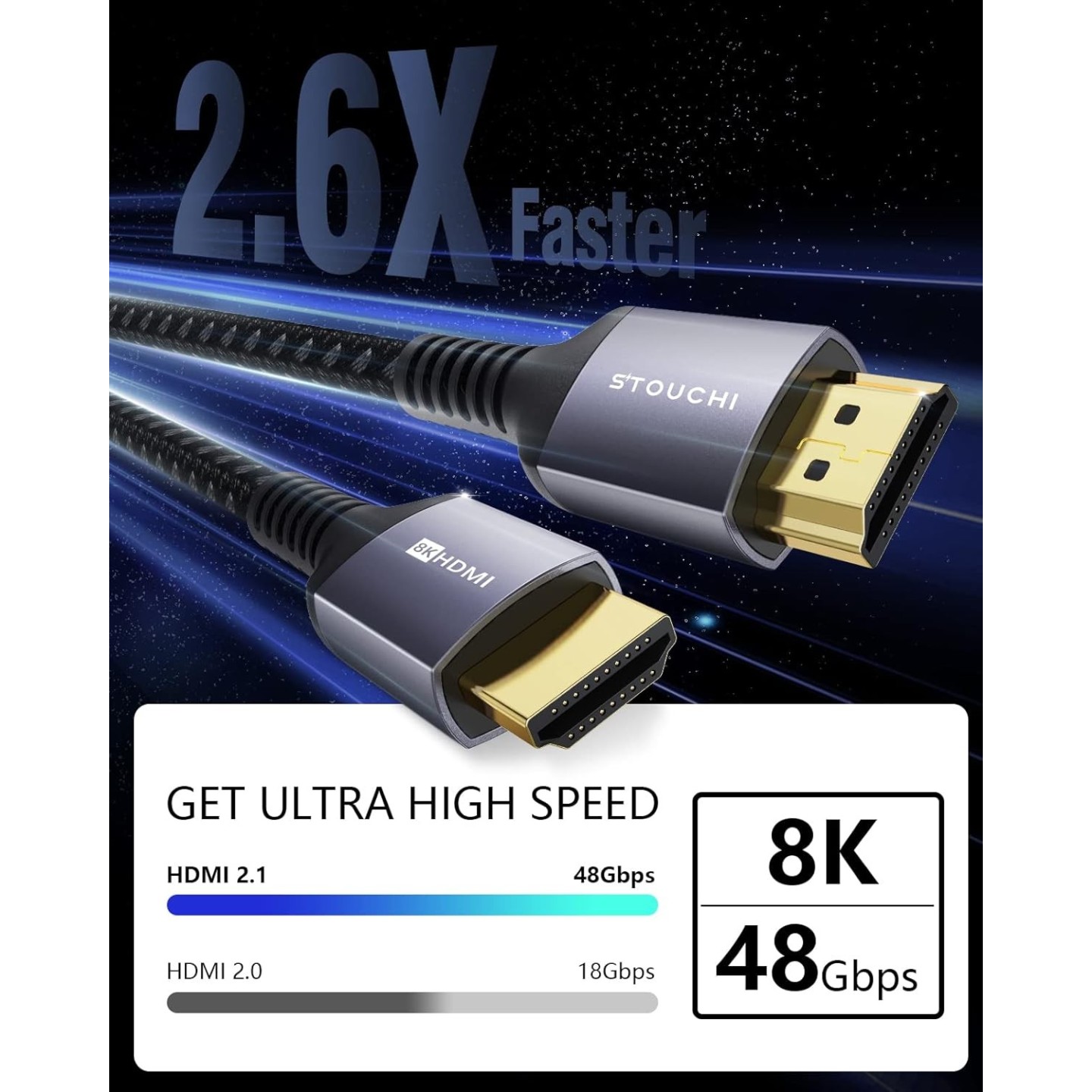- The Stouchi 8K Ultra High Speed HDMI 2.1 Cable (1m/3.3ft) is a premium connectivity solution engineered to unlock the full potential of next-generation home entertainment and high-performance gaming setups. Certified for Ultra High Speed standards, it provides a massive 48Gbps bandwidth to support uncompressed 8K video at 60Hz and high-frame-rate 4K at 120Hz or 144Hz, ensuring fluid motion and crystal-clear clarity. This cable enhances every viewing experience with support for Dynamic HDR, Dolby Vision, and eARC (Enhanced Audio Return Channel), enabling immersive object-based audio formats like Dolby Atmos and DTS:X. For gamers, it offers a competitive advantage with advanced HDMI 2.1 features such as Variable Refresh Rate (VRR), Auto Low Latency Mode (ALLM), and Quick Frame Transport (QFT) to eliminate lag and screen tearing on consoles like the PS5, Xbox Series X, and RTX 3080 PCs. Built for durability, the cable features a robust double-braided nylon exterior, high-purity 30AWG copper wiring, and triple tin shielding to minimize interference, while gold-plated connectors ensure reliable, corrosion-resistant transmission for all your HDMI-compatible devices.