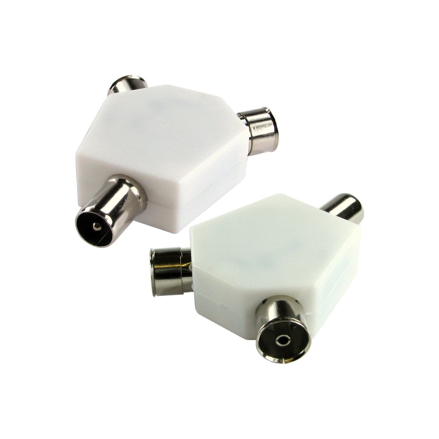 Coaxial splitter adapter typically used to split a TV aerial over coax to two coax inputs such TV's, freeview boxes and similar equipment. Please note that this cannot be used for F type connectors and cables without an adapter.