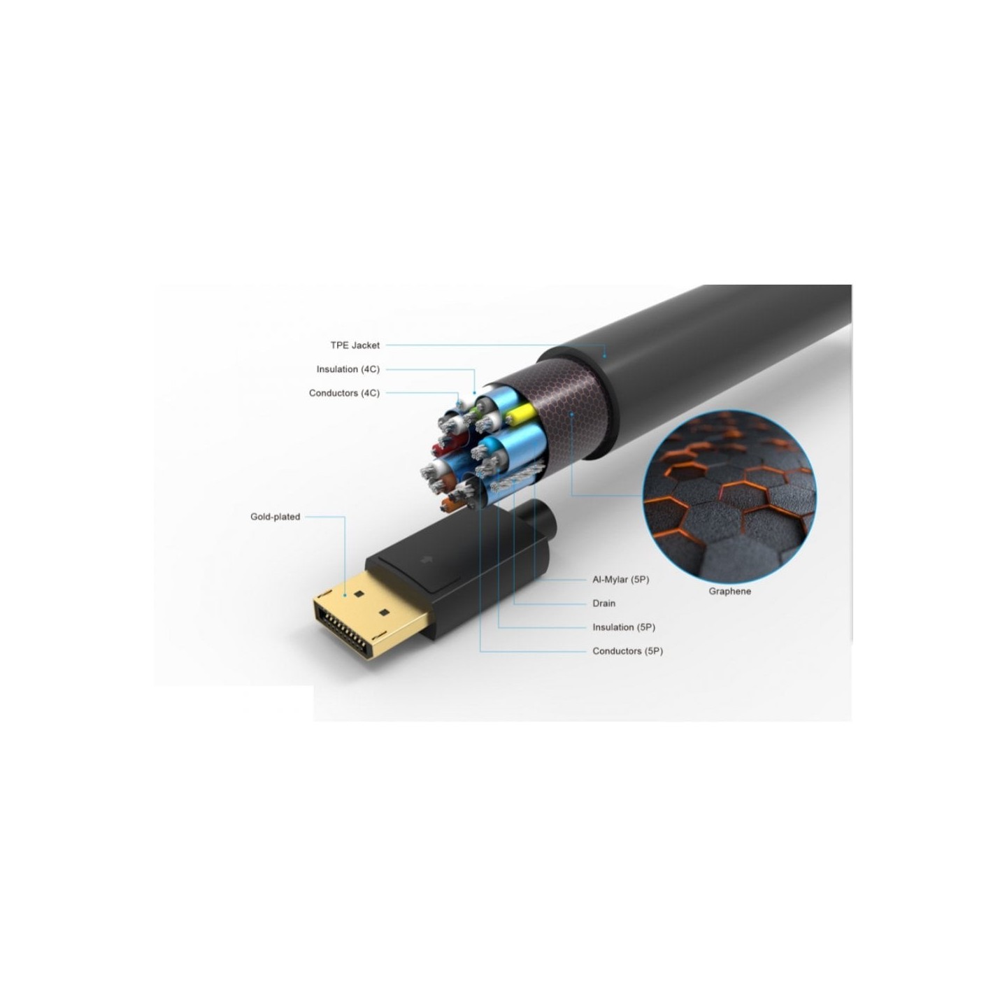 What is graphene? Graphene is a new type of two-dimensional carbon nanomaterial with a stable hexagonal honeycomb lattice composed of carbon atoms. Graphene shielding can cover almost 100% providing superior EMI protection. Coupled with a TPE jacket, this makes the cable thin and flexible while keeping its strength. Our new range of DisplayPort 8k@60Hz cables contain graphene shielding. Due to the graphene shielding and TPE jacket, the cable can be made thinner and the bend radius is also far better.