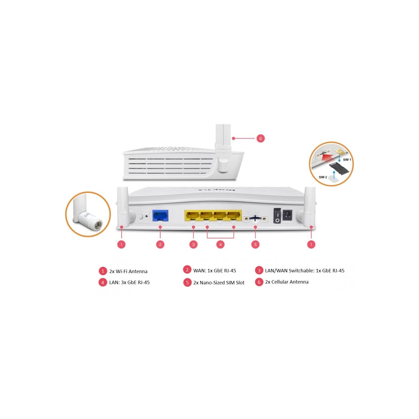 The DrayTek Vigor C510ax is a low-cost firewall VPN router with the 5G/4G mobile Internet connection method. In addition, it can use any one of the three methods for its primary WAN (Internet) connectivity, falling back to one of the others in case of service interruption. It has a Dual-SIM cellular 5G/4G modem, Ethernet (RJ45 – which can connect to many other WAN delivery sources), and wireless WAN ('ax' models can fall back to a wireless hotspot such as phone's tethering, a web café, someone else's office etc.).The built-in Wi-Fi 6 module can provide Internet access and support local wireless LAN at the same time. The Vigor C510ax routers also offer extensive Firewall features, Content Filtering, VPN client/server and Quality of Service controls.The latest DrayTek's DrayOS 5 system enhance security-focused capabilities of the router thanks to the Identity and Access Management (IAM), a hotspot web portal, and more, making it ideal for businesses requiring robust and secure network solutions.