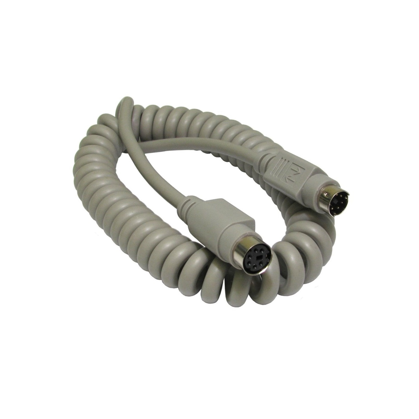 Coiled 6 pin mini din PS/2 extension cable, compact when coiled but two metres uncoiled.