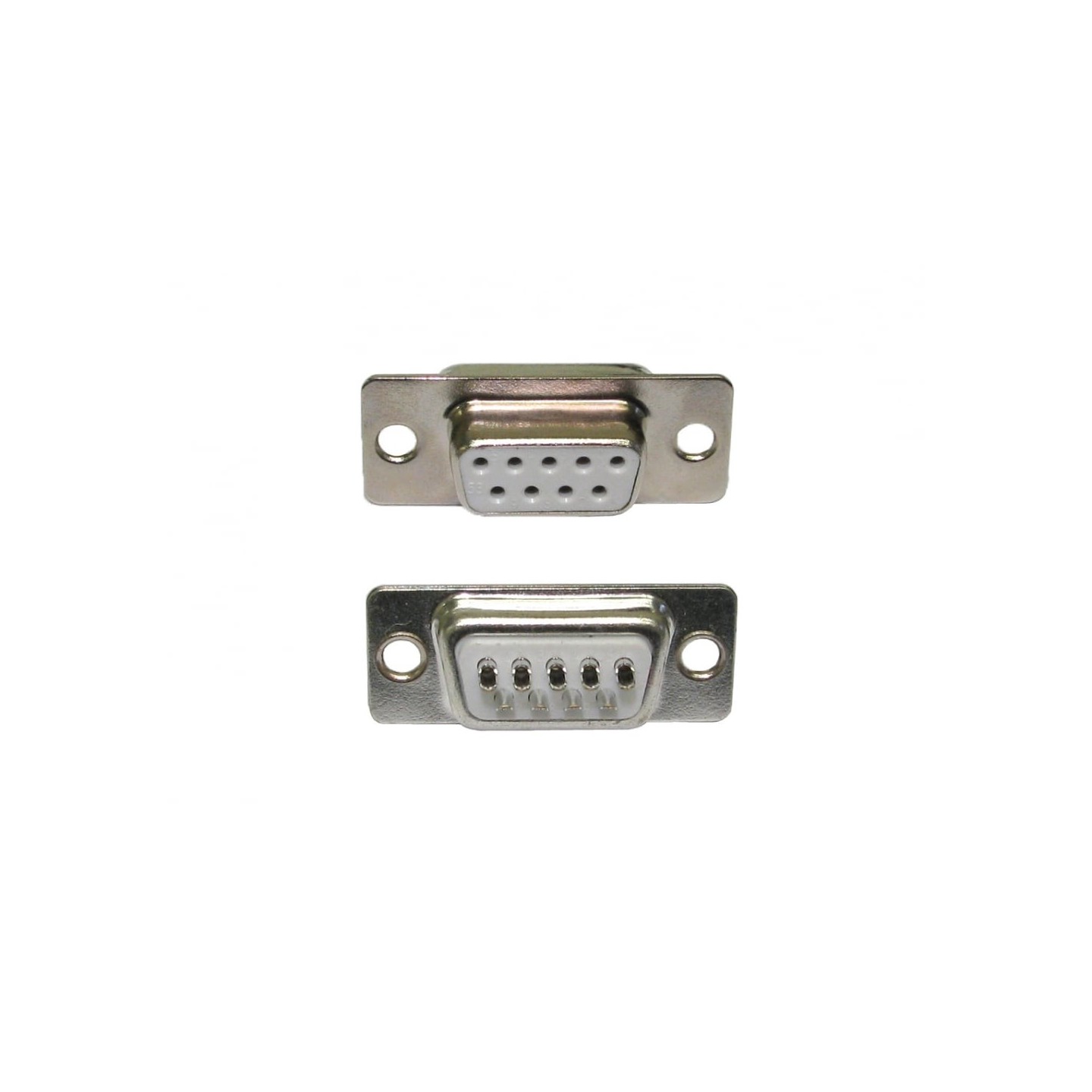 D9 female connector solder type, configured in two rows (5,4). The front of the connector is of D shape with 9 female pins (D9), the back of the connector is D shape with 9 male pins with grooves cut out to place cable in and solder. These connectors do not come with screws, screw posts or nuts and washers.