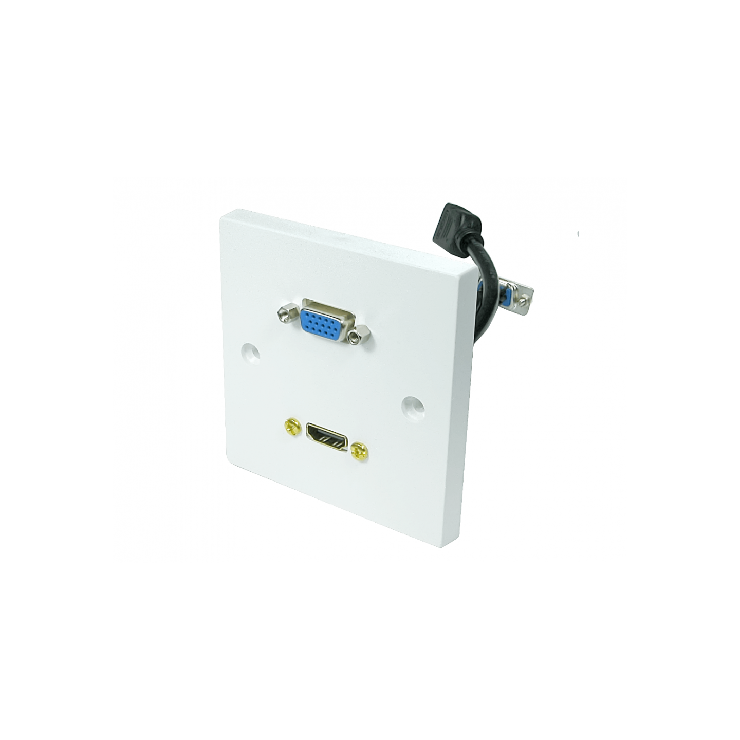 The ZZ-HD1-STUB is a single faceplate with HDMI and VGA Stubs only. This standard faceplate comes with female connectors on the front and female connectors on the other end of cable, can come in lengths of stub, 3, 5, 7, 10, 15 and 20m.RCA and 3.5mm stereo stubs/cables can be added if requested.Back boxes can also be added if needed.Contact sales for a quote !We can also make customised faceplates.