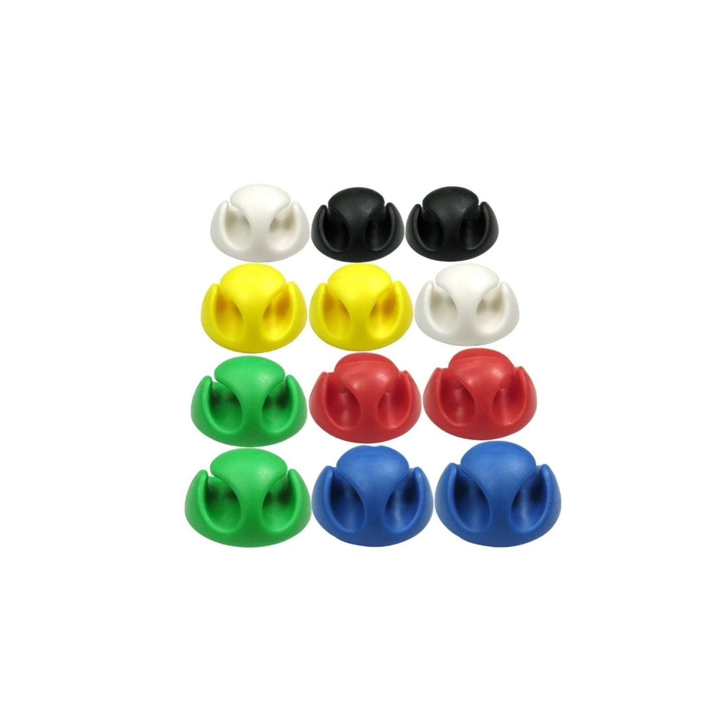 The desk tidy cable holders have two ports/channels to organise cables. They have a self-adhesive bottom that will stick firmly to most surfaces but at the same time is easy to remove. Each channel will hold either a large cable or a few thin cables.This is a mixed pack of 12 colours. two of each.
