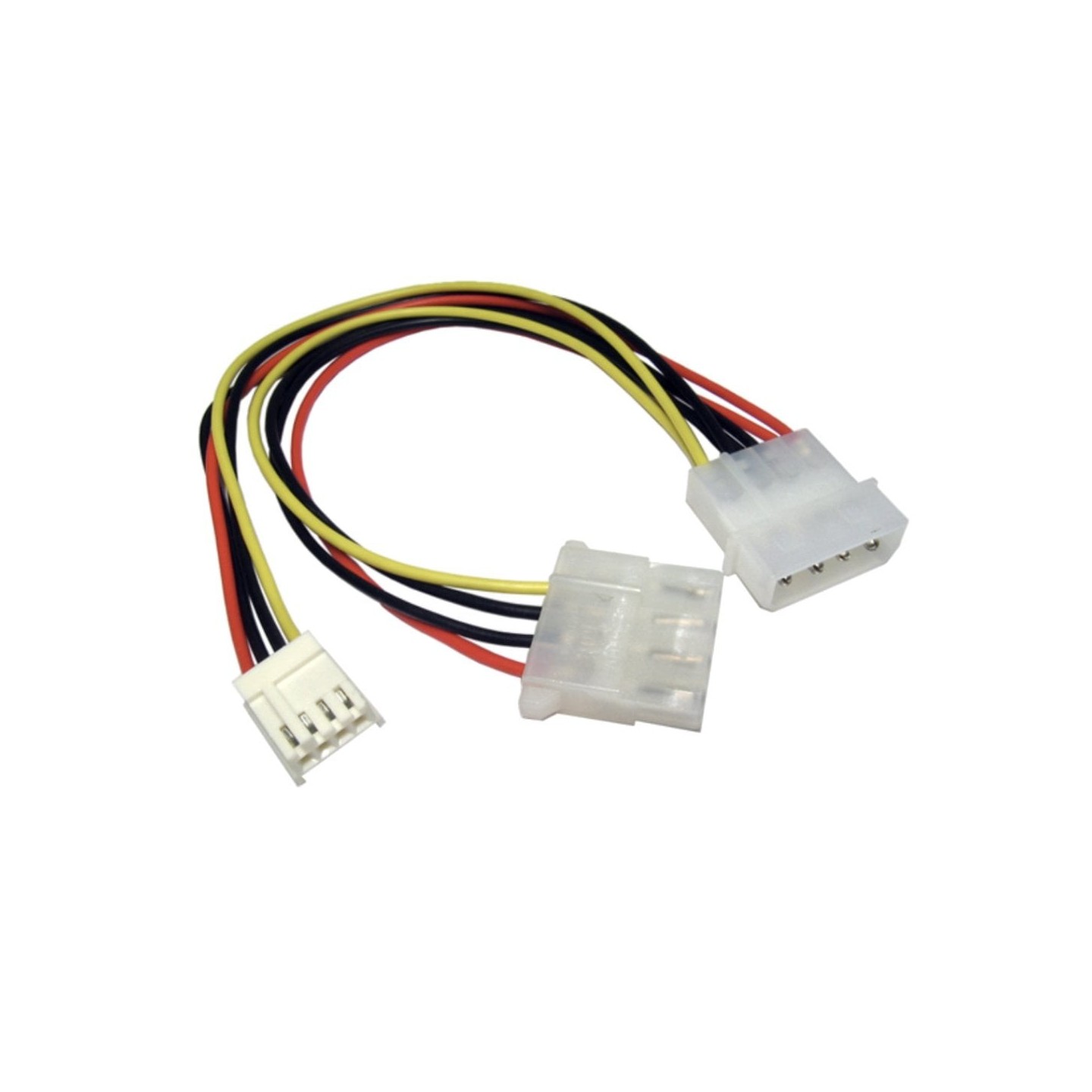 Molex extension 4 pin female to 4 pin male with 4 pin female floppy power (mini-spox). Used for adding a floppy drive connector without losing your 4 pin molex.
