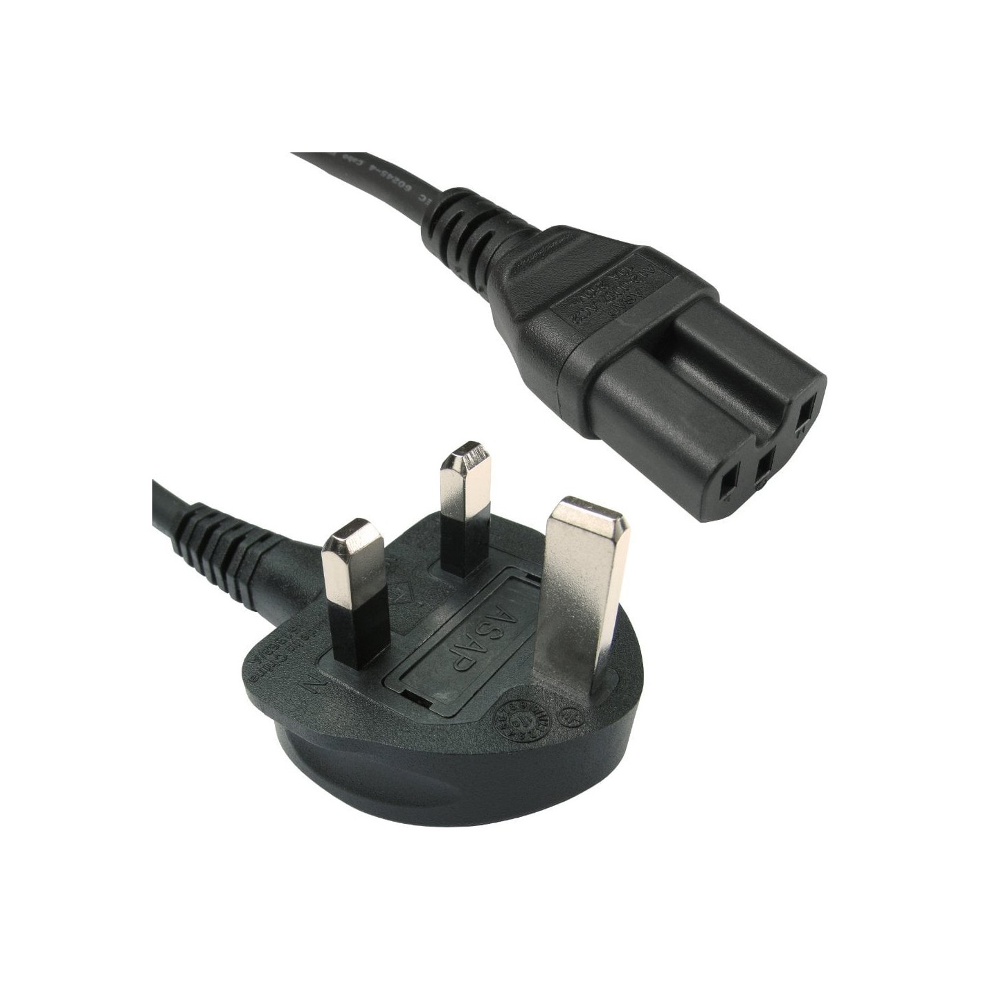 The UK to IEC C15 mains cable, more commonly known as a kettle lead is used for powering a variety of electrical appliances such as PC base units, monitors, printers & photocopiers and a whole host of other equipment including high temperature devices such as kettles.