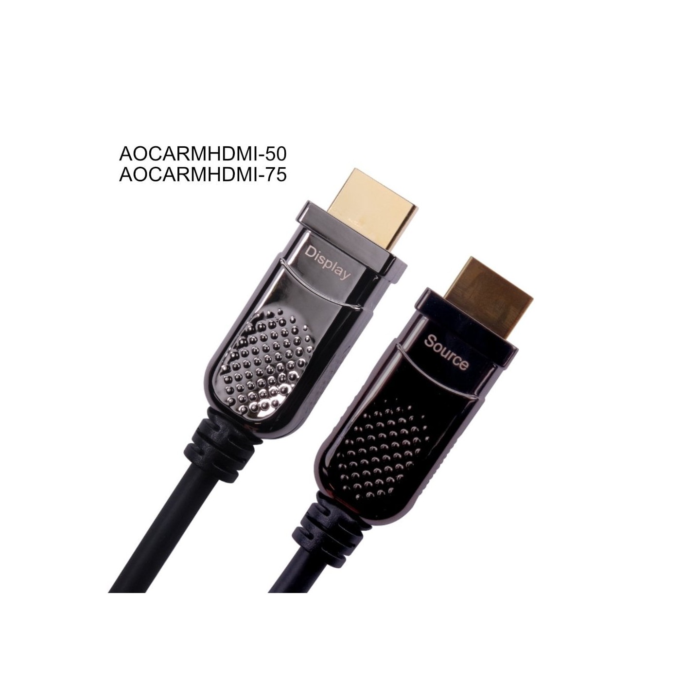 What is AOC?AOC is short for Active Optical Cable which is the latest in cabling technology. AOC removes the copper conductors and replaces them with fibre optical cores and a small transmitter and receiver in the connectors. Copper cores still remain to carry power along the cable. Why Professionals Are Choosing AOC?The use of fibre optical cores allows the cable to be thinner and lighterThe barriers of cable length is no longer a problemBy using fibre optical cores, EMC interference from power cables and lighting is no longer an issue. The cables also produce much less EMC themselvesNo signal loss over long distancesNo extenders, boosters or runs of CAT5e needed. These simply connect to your host and device like a standard cableOur AOC comes in frustration free packagingThe armoured cables consist of stainless steel armour under the TPE jacket with an overall layer of Kevlar armour and the 4 fibre cores wrapped in Kevlar armour for further protection.Please Note: This cable must be connected with the Source connector connected to the device & Display connector connected to the display. 50m & 75m do not support eARCCompatible with Xbox Series XPS5Nvidia RTX 3090