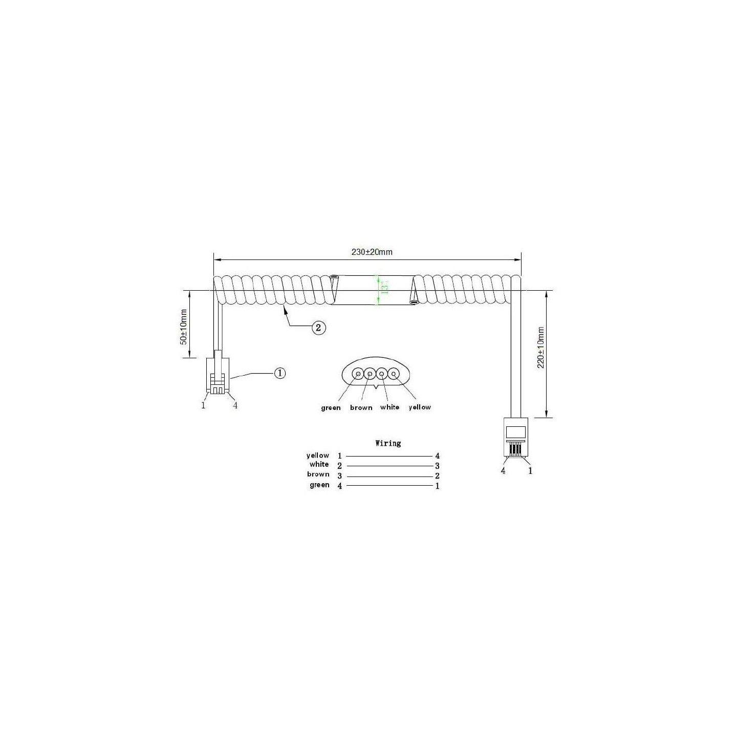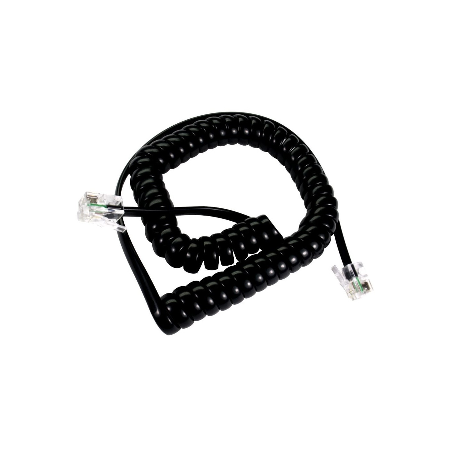 The coiled handset cable uses an RJ10 4P4C connector for use with telephone handsets.23cm coiled with 22cm tail one end & 5cm tail on the other end.