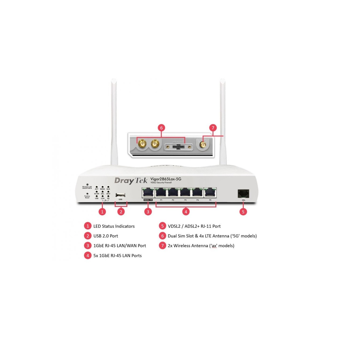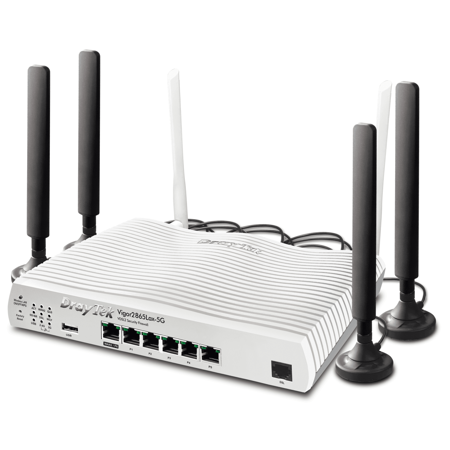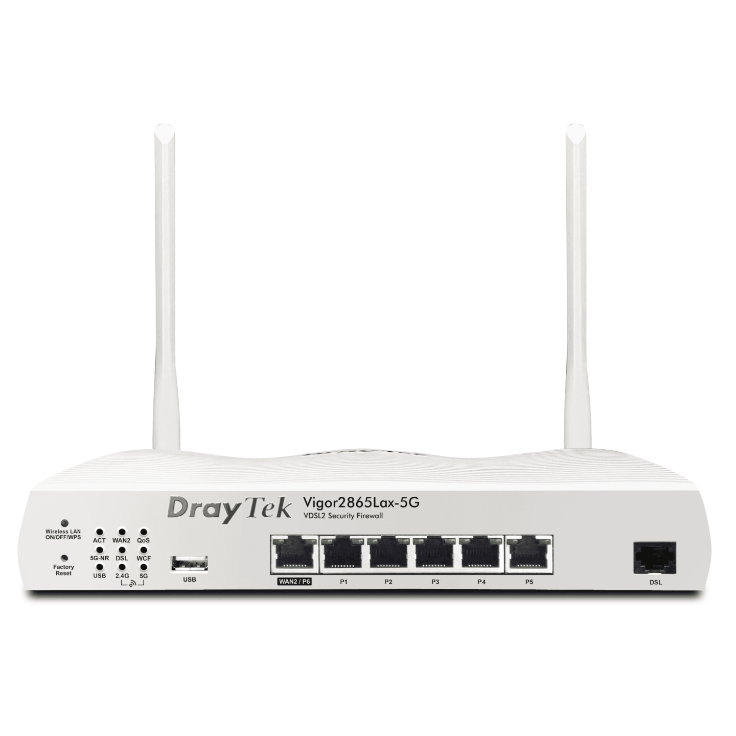 DrayTek's Vigor 2865 series Multi-WAN Firewall VPN routers are well-suited for Superfast VDSL Broadband and Ethernet-based FTTP Fibre Broadband. Offering Gigabit throughput, Quality of Service, VPN client/server, comprehensive Firewall, and Content Filtering controls, the 2865 series stands out as one of the most versatile devices on the market, compatible with various network requirements.The new Vigor 2865Lax-5G model integrates a 5G/LTE modem, enabling users to leverage mobile broadband effectively, whether for failover or load-balanced broadband connections. Additionally, its Wi-Fi 6 module ensures rapid and efficient wireless connectivity with DrayTek VigorAP access points and end devices.