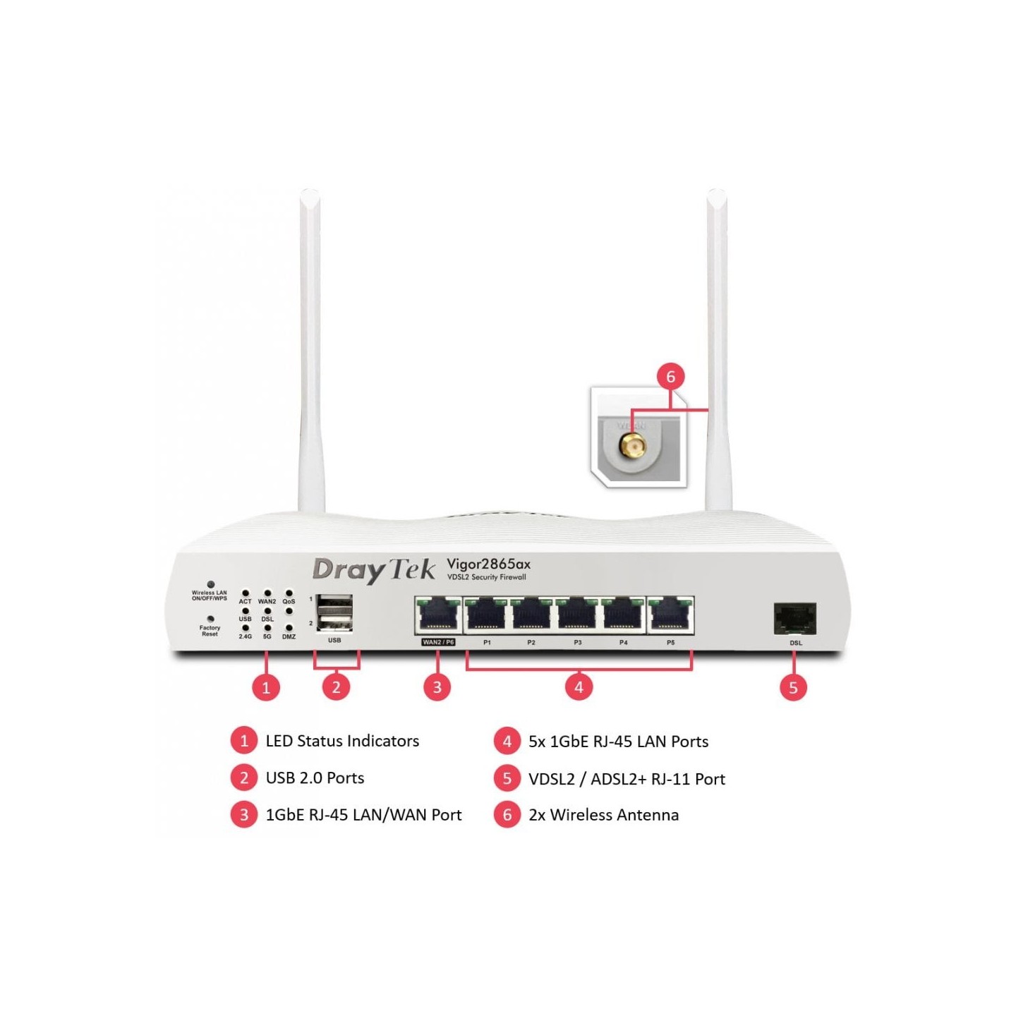 Box ContentsVigor 2865ax routerQuick Start Guide Screws & wall plugs for wall mounting2m Cat-5e RJ-45 Network Cable2x Detachable Wireless LAN AntennasDC 12V Power Supply with UK Plug
