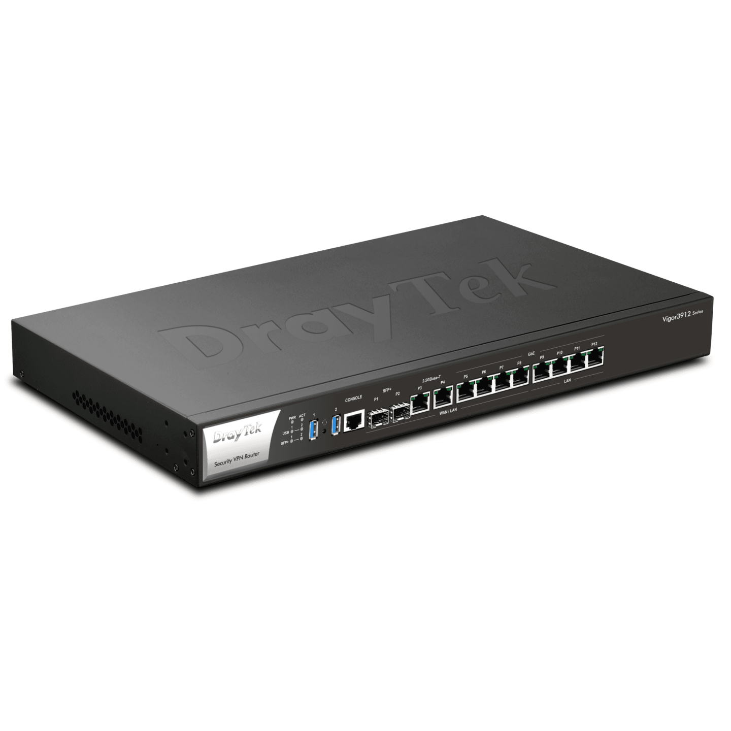 The DrayTek Vigor 3912 series is a premium next generation multi-WAN router making it ideal for your most demanding and complex networks. The Vigor 3912S model has a 256GB SSD, enabling you to install Docker-compatible applications such as the VigorConnect management platform, or the Suricata Intrusion Detection System (IDS).Featuring 12 LAN and WAN interfaces in total, 4 dedicated LAN ports and 8 switchable ports that can operate as LAN or WAN ports to fit your network requirements.With up to 12Gb/s of NAT & Firewall throughput, the Vigor 3912S is suitable for the most demanding and bandwidth intensive SME applications. Each of the WAN ports on the Vigor 3912S can be grouped together to provide Load Balancing or operate as Failover or Backup WAN connections.Based on the familiar DrayOS platform, the Vigor 3912S combines high performance and capacity with DrayTek's traditional ease of use and comprehensive feature set.For multi-tenant or departmental flexibility, the Vigor 3912 series will support multiple LAN IP subnets, together with VLAN capabilities and user management, providing access to WAN resources only to the appropriate users or departments, as well as maintaining infrastructure efficiency.