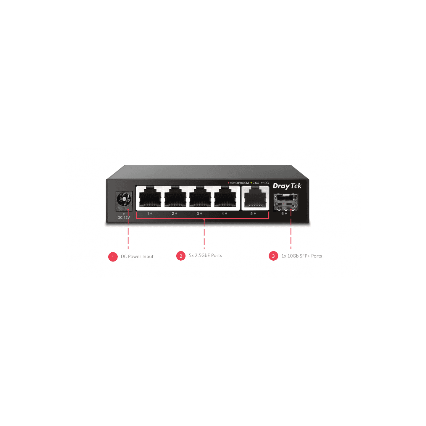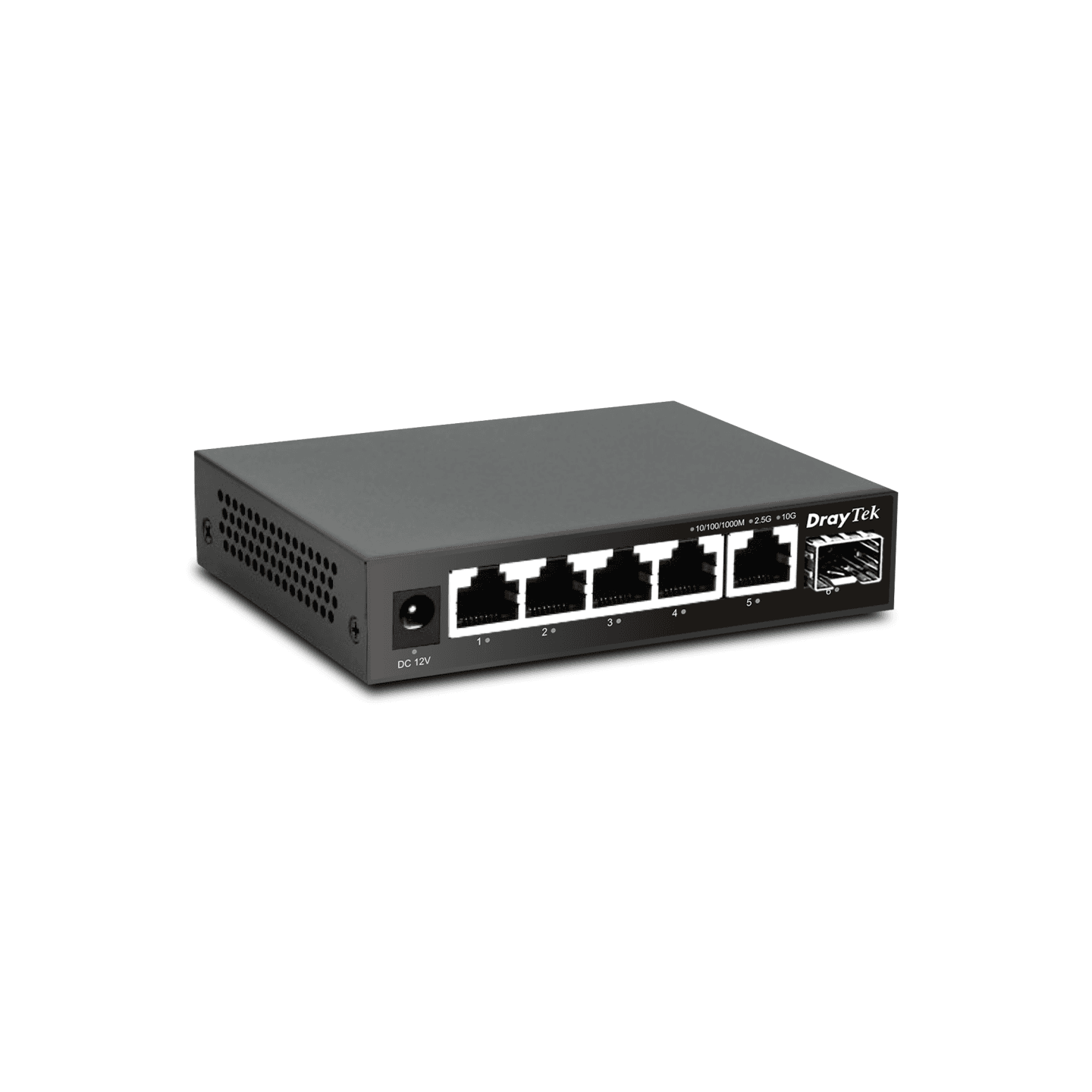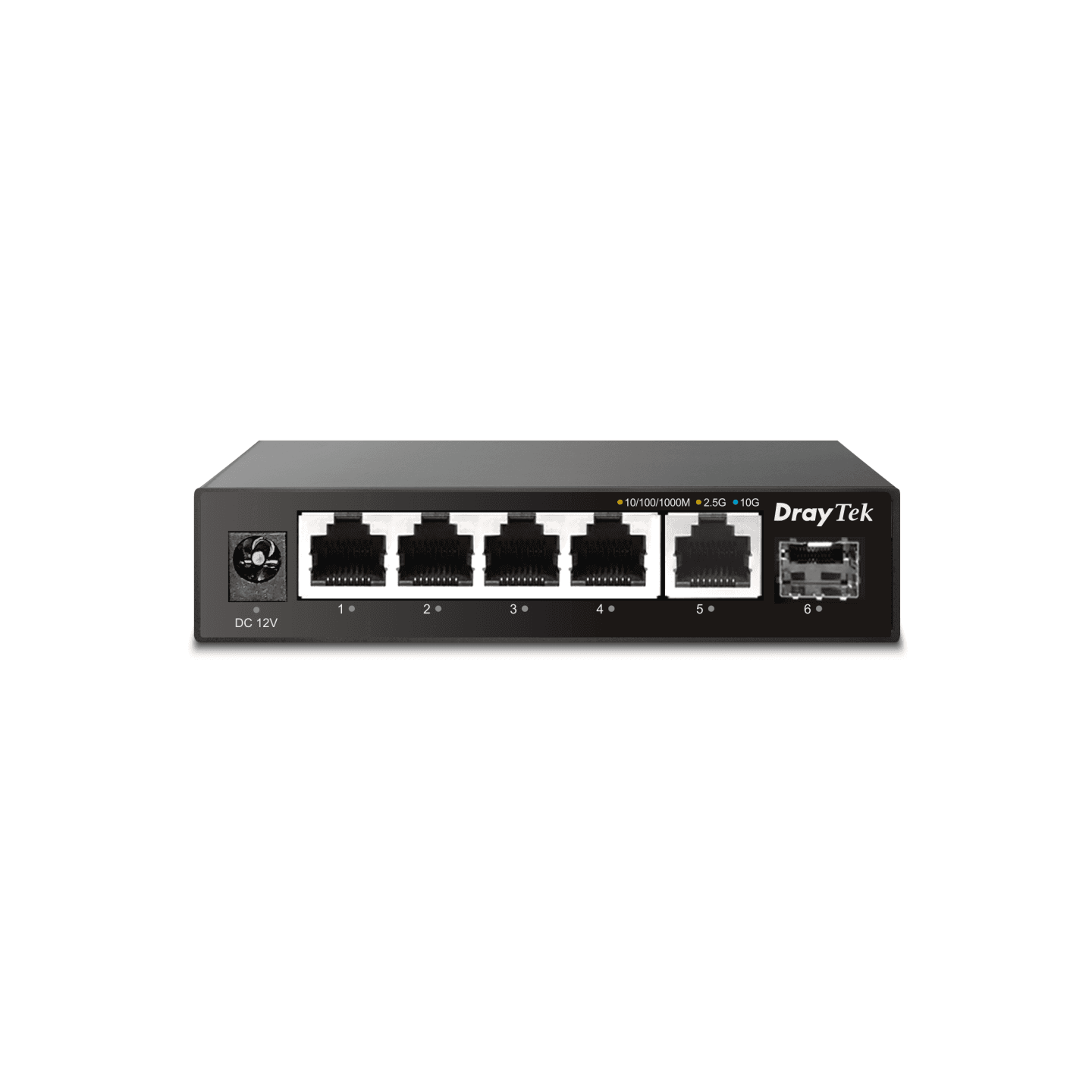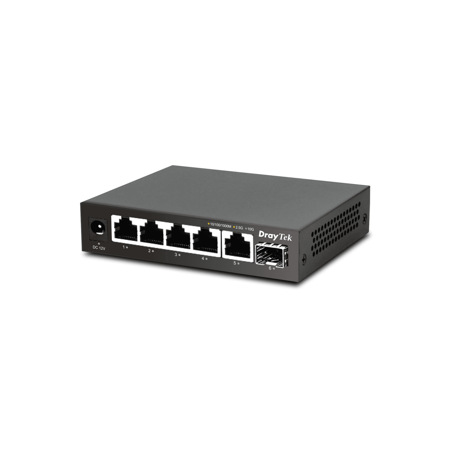 VigorSwitch Q60x is a small, high-performance unmanaged 2.5 Gigabit Ethernet switch with 5 x 2.5-Gigabit RJ-45 LAN ports and 1 x 10-Gigabit SFP+ port. Use the faster 2.5 GbE ports for high-speed connections between switches, servers, and wireless access points such as the VigorAP 805. The 10Gb SFP+ interface can be an ideal option for uplink purposes to connect to a router or another switch.Our lightweight, low-power network switch is easy to deploy. This VLAN-aware device requires no configuration, offers fanless operation, and comes with a power supply.