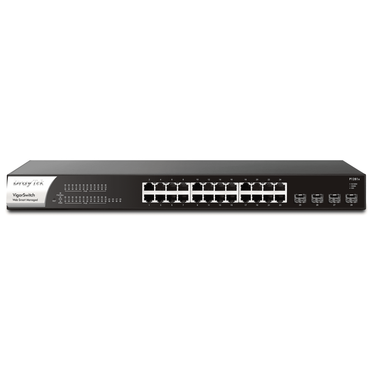 VigorSwitch P1281x is a smart switch with 24 x GbE PoE+ Ports (total of 140W output) and 4 additional independent SFP+ 10Gbps interfaces. Use the SFP+ interfaces for high-speed uplinks between switches, servers and network attached storage devices at up to 10Gbps per port.Designed for centralised management, the VigorSwitch P1281x can be provisioned and monitored with the VigorACS management platform, the free VigorConnect single site management system or, with a DrayTek Vigor router's Central Switch Management. Easily provision VLAN configuration through the router and clone switch configurations. Drastically reduce the setup time required for a complex network and configure an entire DrayTek network remotely.
