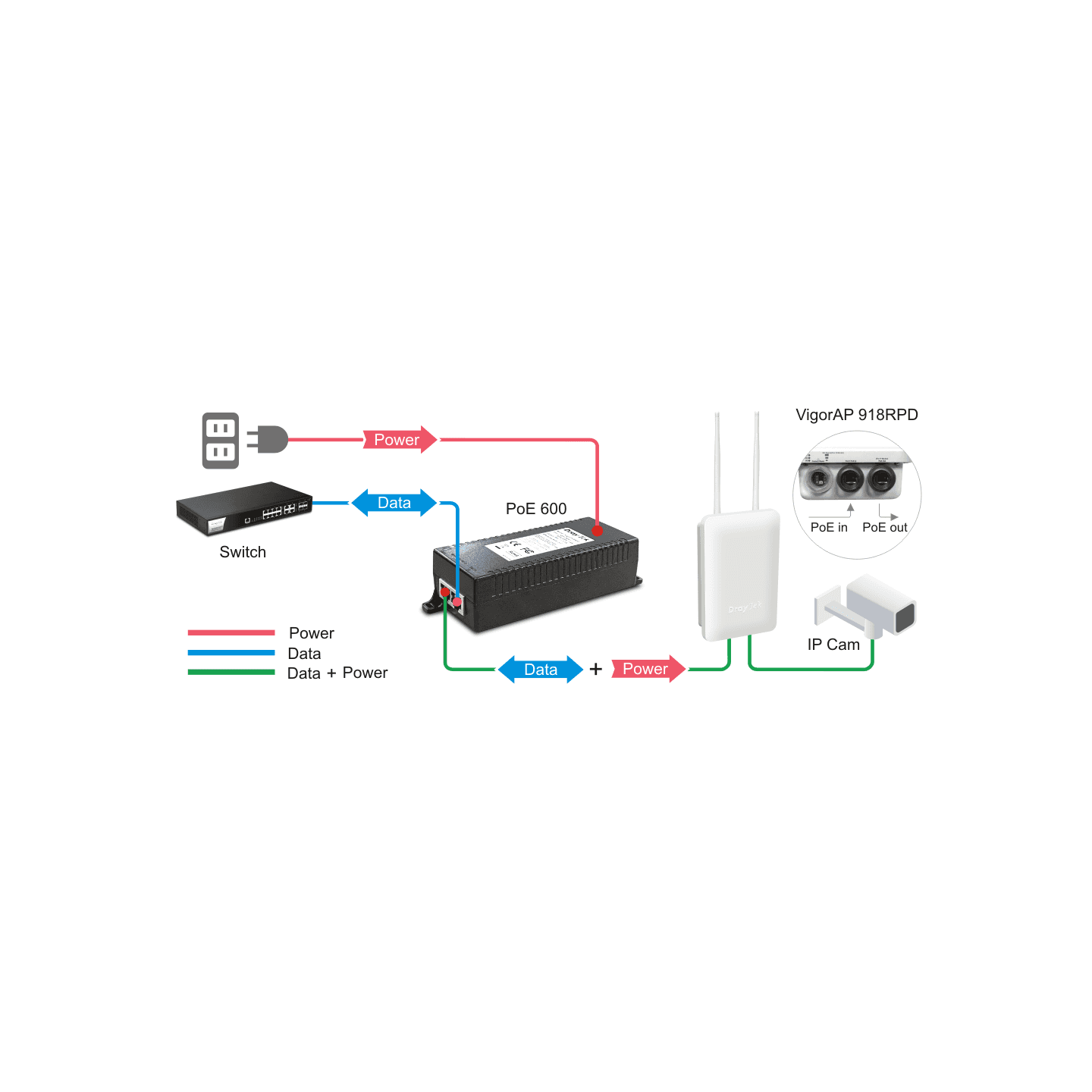 The VigorAP 918RPD and VigorAP 920RPD outdoor access points have a secondary LAN port that provides PoE Output (PoE-PSE), to power an additional PoE device through a single cable run.Use the DrayTek VigorPoE-600 High-Power PoE Injector to power additional devices through the VigorAP 918RPD's secondary LAN port.This powers the VigorAP 918RPD and provides up to 16 watts power output to the device connected to the VigorAP's PoE Out port, over a 100 meter CAT5e/CAT6 cable run. Connect a camera near to the VigorAP, or daisy-chain an additional AP through the one cable.Please note, this POE Injector is proprietary and is for use with the DrayTek VigorAP 918RPD/920RPD only.The VigorPoE-600 is not directly compatible with 802.3af / at PoE products.