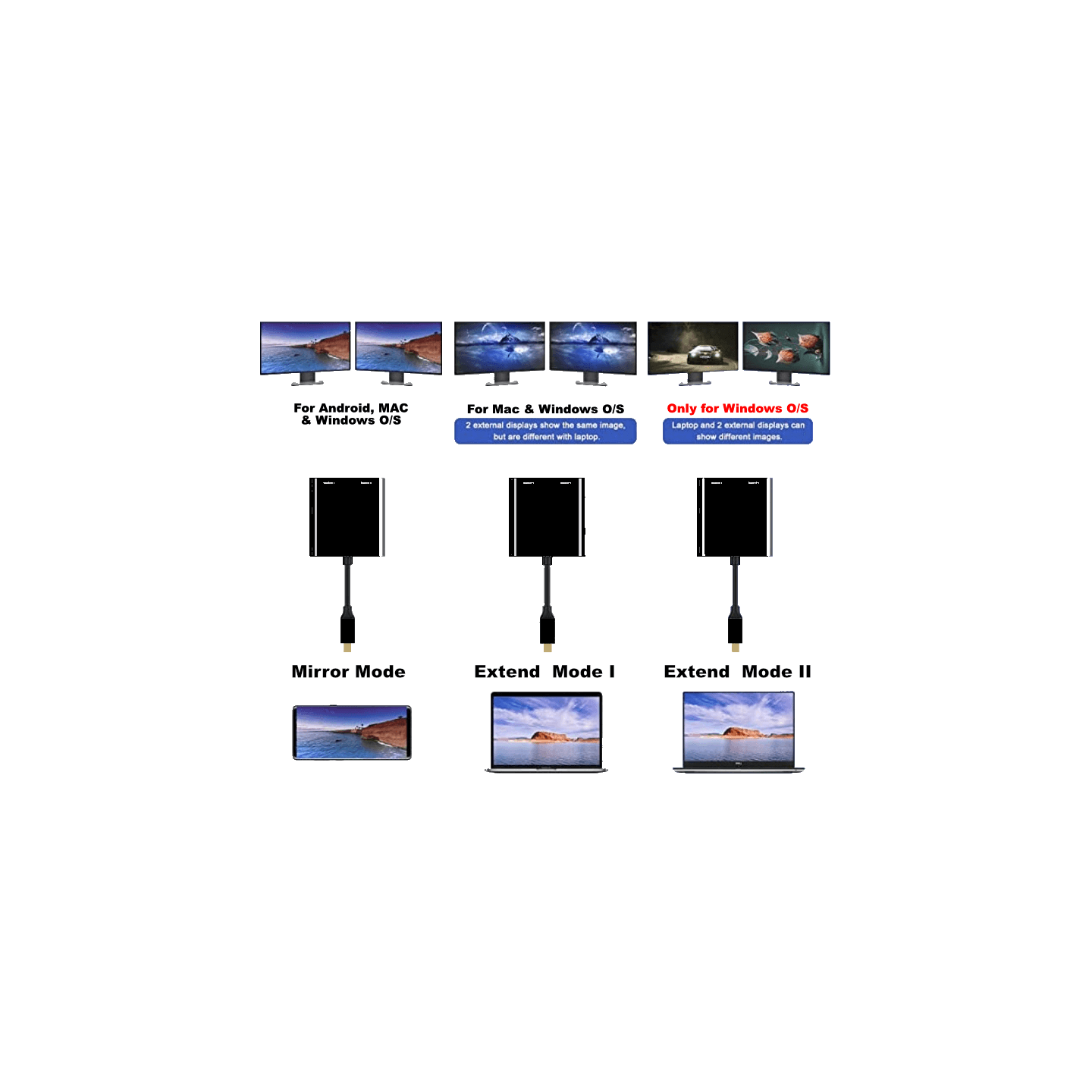 Our USB C HDMI MST adapter allows you to connect two HDMI displays to a source with a USB C port. MST functionality allows the two screens to act independently of each other in extend mode, this adapter also supports mirror mode.MST adapters are more suitable for laptops and computers that have limited ports such as 1 USB C port. This adapter allows you to connect two computer screens or TVs with 4k@60Hz to your Laptop/computer.For full functionality, the source must have a USBC DP Alt mode v1.4. If using DP Alt mode v1.2, the resolution will drop to 4k@30Hz.