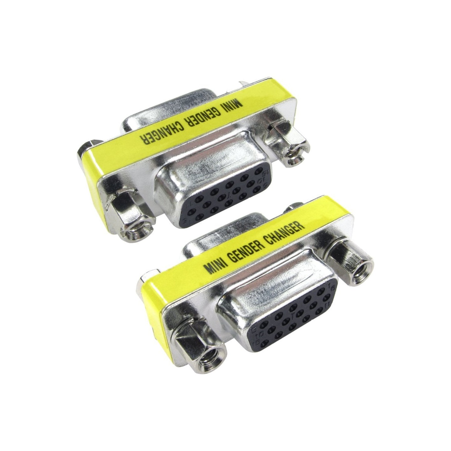D15 high density female to female slimline gender changer. The D15 high density differs from the D15 low density in that the pins are configured in three rows(VGA) as opposed to two rows(gameport, MIDI port etc).