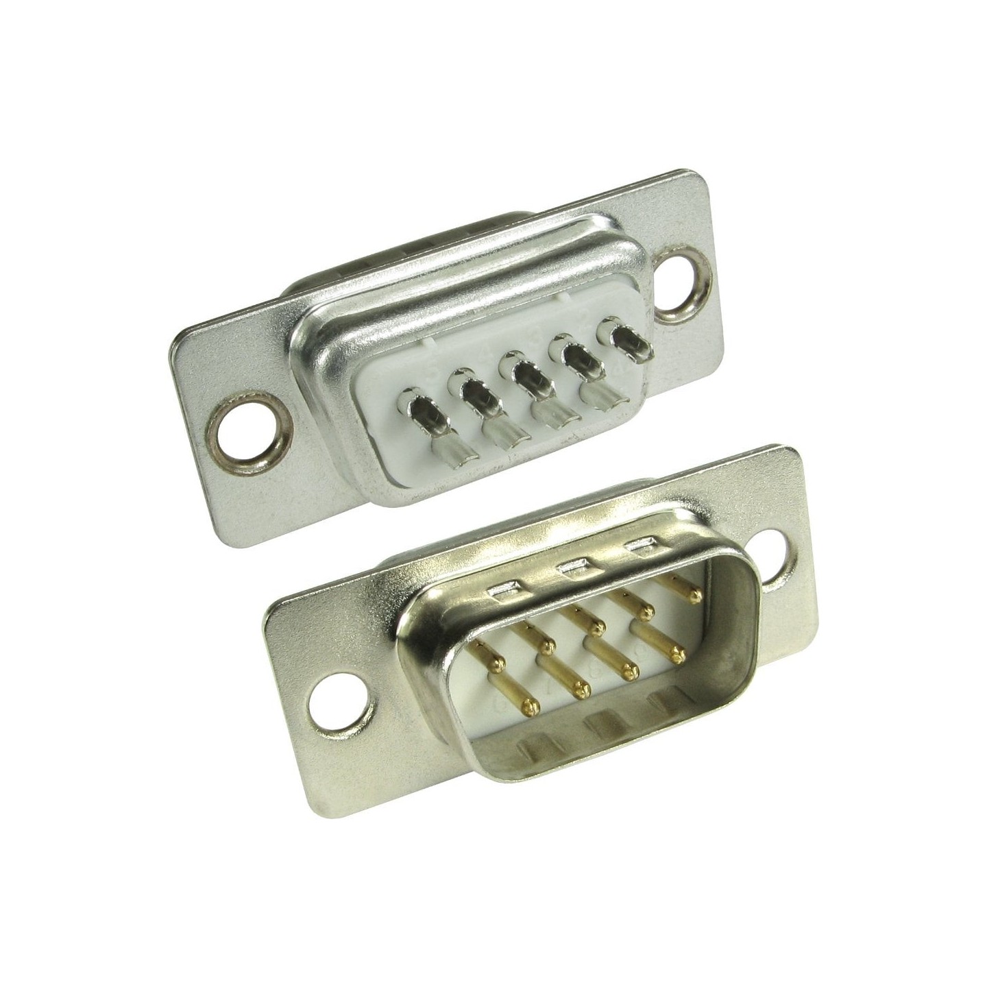 D9 male connector solder type, configured in two rows (5,4). The front of the connector is of D shape with 9 male pins (D9), the back of the connector is D shape with 9 male pins with grooves cut out to place cable in and solder. These connectors do not come with screws, screw posts or nuts and washers.
