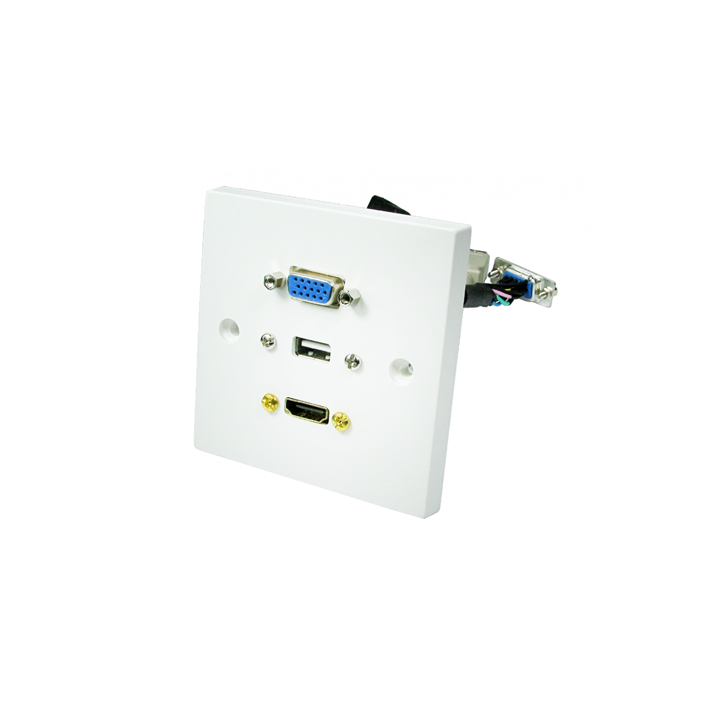The ZZ-HD2-STUB is a single faceplate with HDMI, VGA and USB type A connectors and stub cables. This standard faceplate comes with female connectors on the front and female/male connectors on the other end of cable, can come in lengths of stub, 3, 5, 7, 10, 15 and 20m.The USB connection will be a stub cable only unless otherwise stated.Back boxes can also be added if needed.3.5mm stereo as well as RCA connectors can be added too in either stub or cable form.Contact sales for a quote !We can also make customised faceplates.