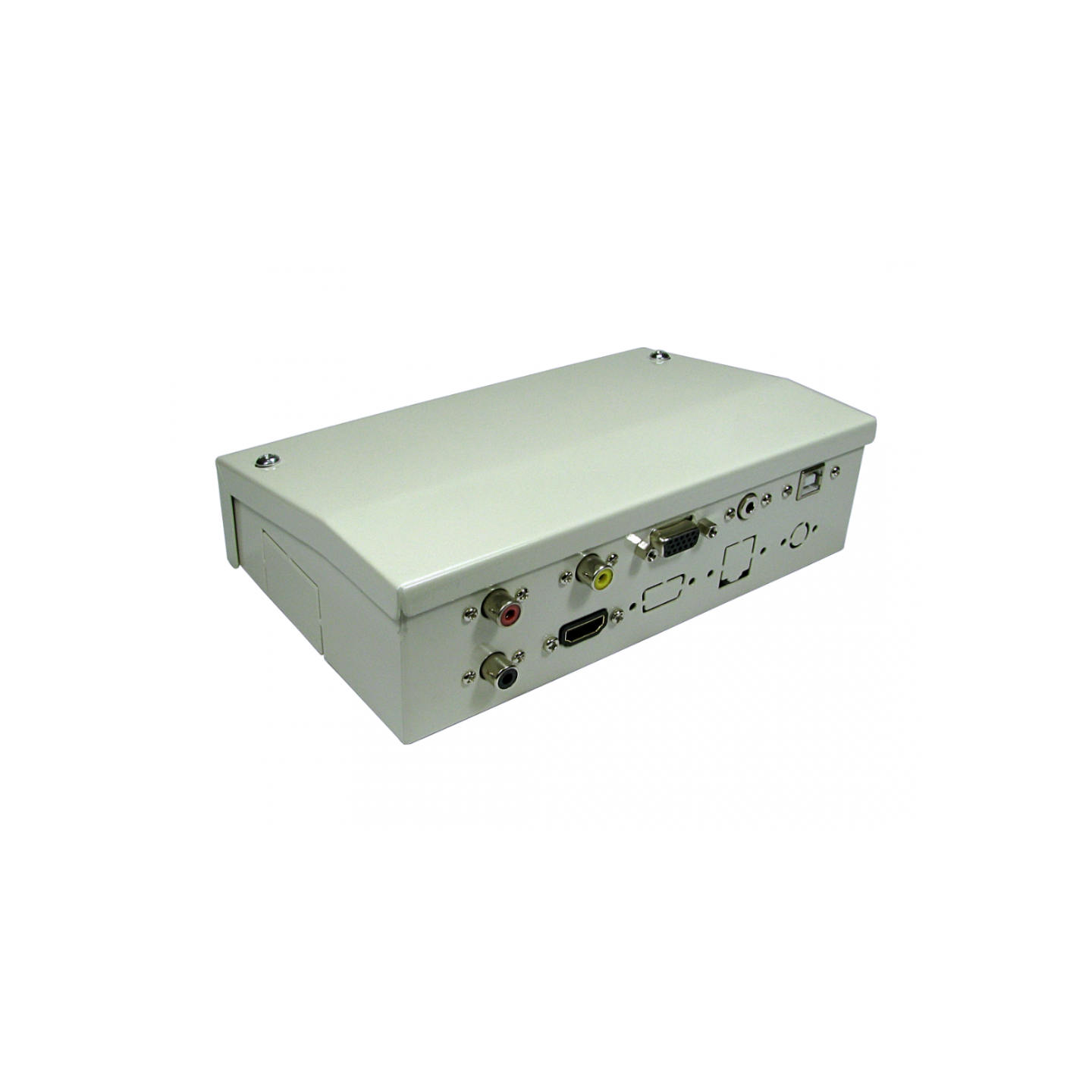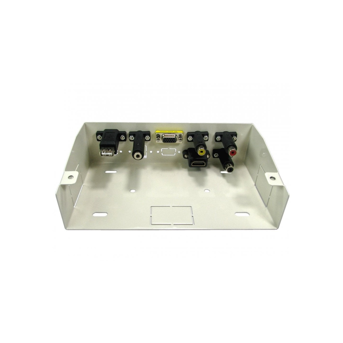 The AVMULTI-METALBOX-7P is a metal AV box of modular type so you can change/add as required, the connectors are coupler type so all you have to do is attach your cables. Before attaching cables you will have to snap off the desired removable plates to fit your cable through. These boxes have mounting holes for walls or desktops and a choice of cable entry points.This multi AV metal box is also available as kits with cable lengths of 5 and 10 metre. Please see your account manager for pricing and details.