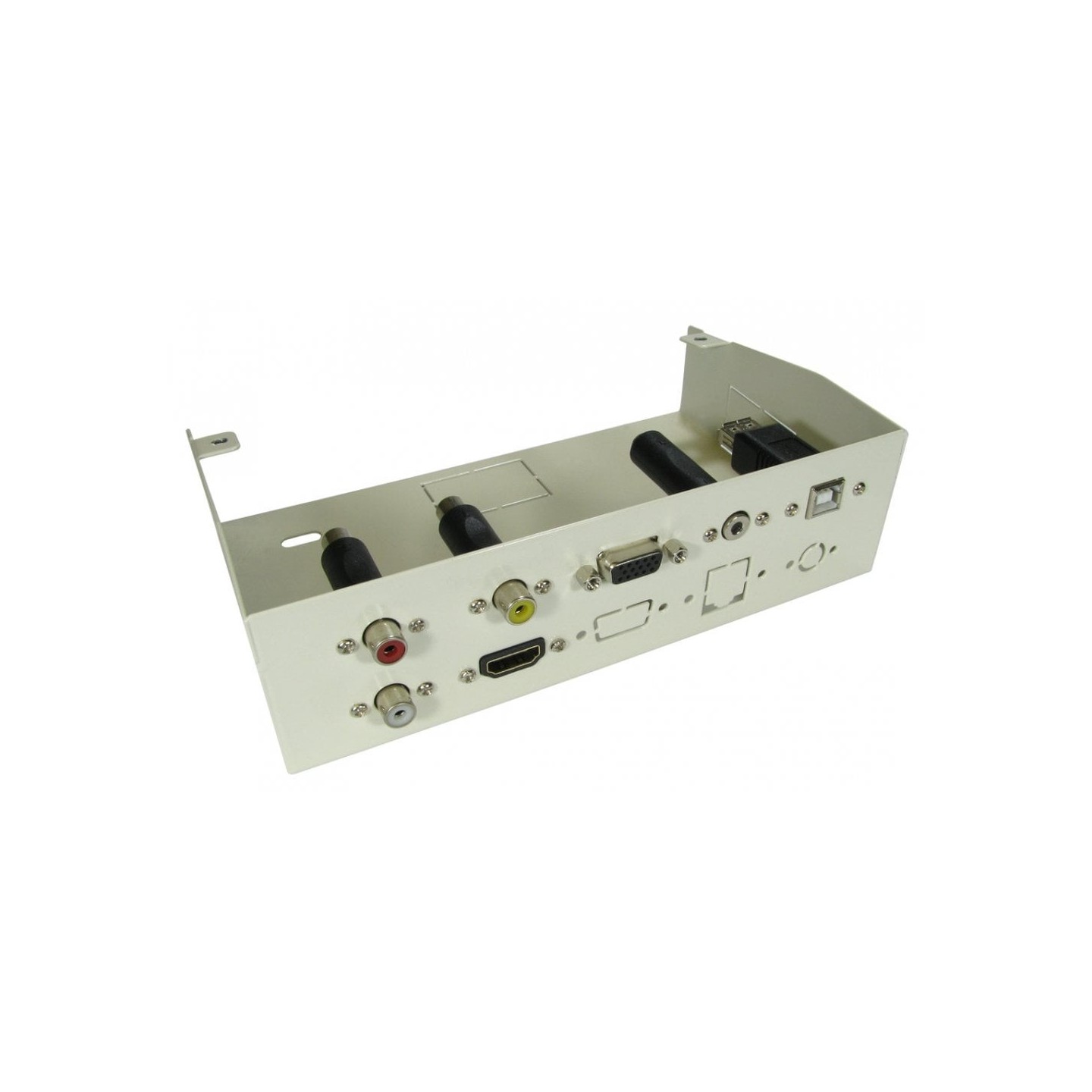 The AVMULTI-METALBOX-7P kits are metal AV boxes of modular type so you can change/add as required, the connectors are coupler type so all you have to do is attach your cables. These boxes come with mounting holes for walls or desktops.These multi AV metal boxes kits are available with 5 or 10 metre cables.