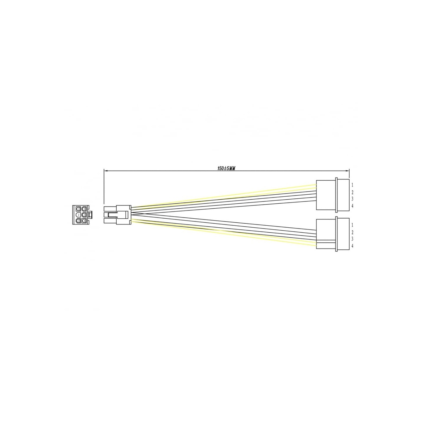 PCI Express graphics card power cable with two Molex 4 pin connectors.Please note that there are two types of 6 pin connectors which look similar, our connector has rounded corners on pin 5 making it a PCI-e connector (see picture).